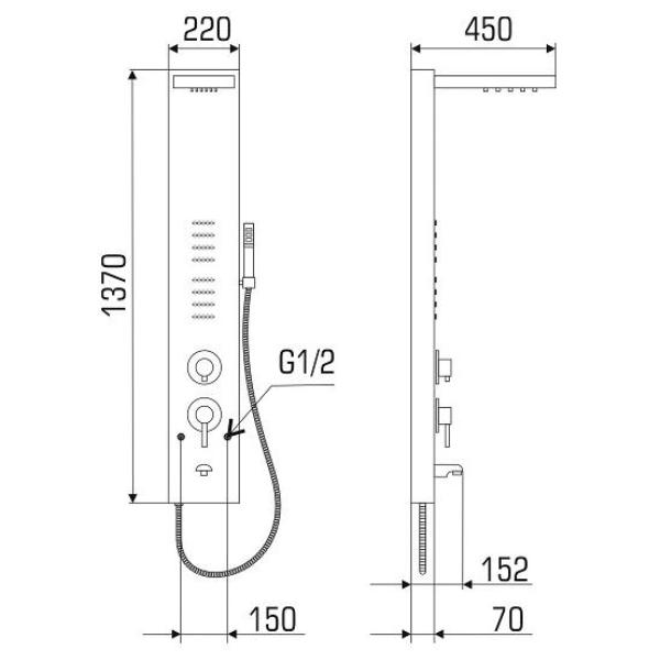 Душевая панель с гидромассажем AVEK Art 1370х220х450 мм, гидромасcажные форсунки, смеситель, верхнмий душ, каскадный душ, излив, ручной душ 10037