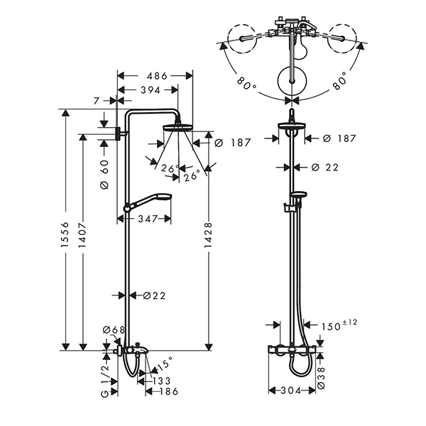 Душевая система HANSGROHE Croma Select S Showerpipe 180 2jet с термостатическим смесителем для ванны 27351400