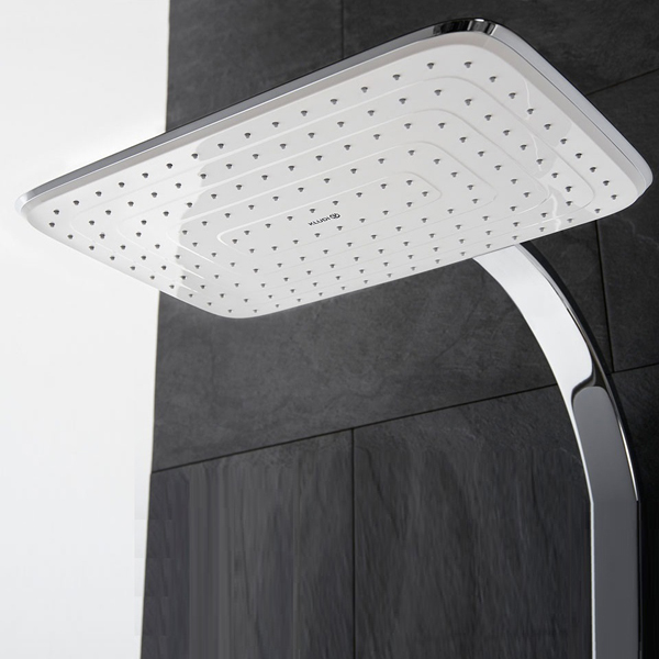 Верхний душ имеет прямоугольную форму, струя воды покрывает все тело