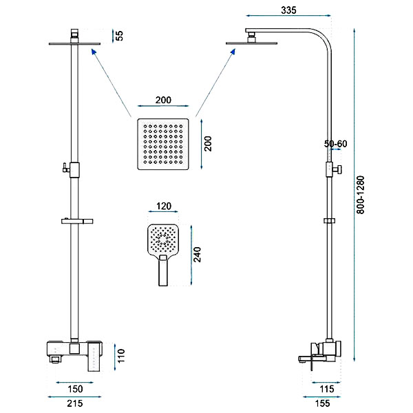 Высота душевой штанги – 800 - 1280 мм