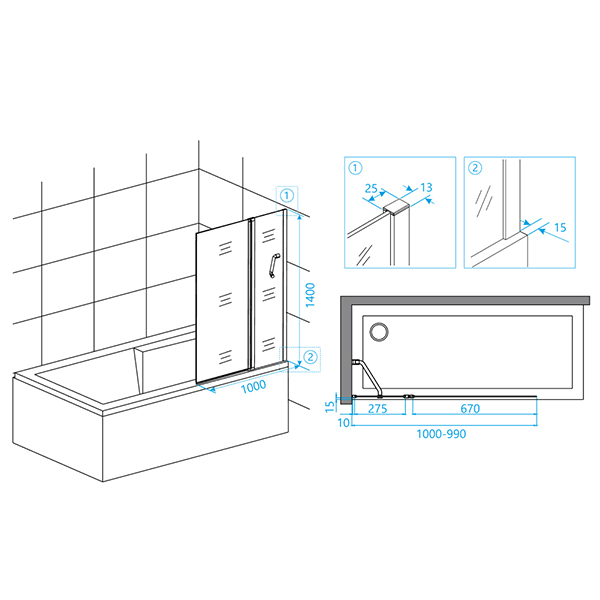 Стационарное стекло 300 мм + подвижное стекло 700 мм.