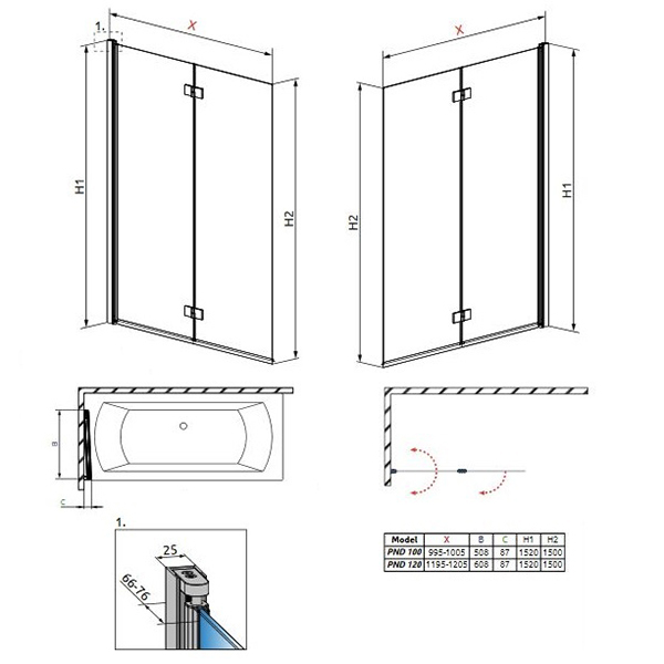 - шторка складывается по середине внутрь ванны, стекло ближе стены поворачивается внутрь и наружу ванны.