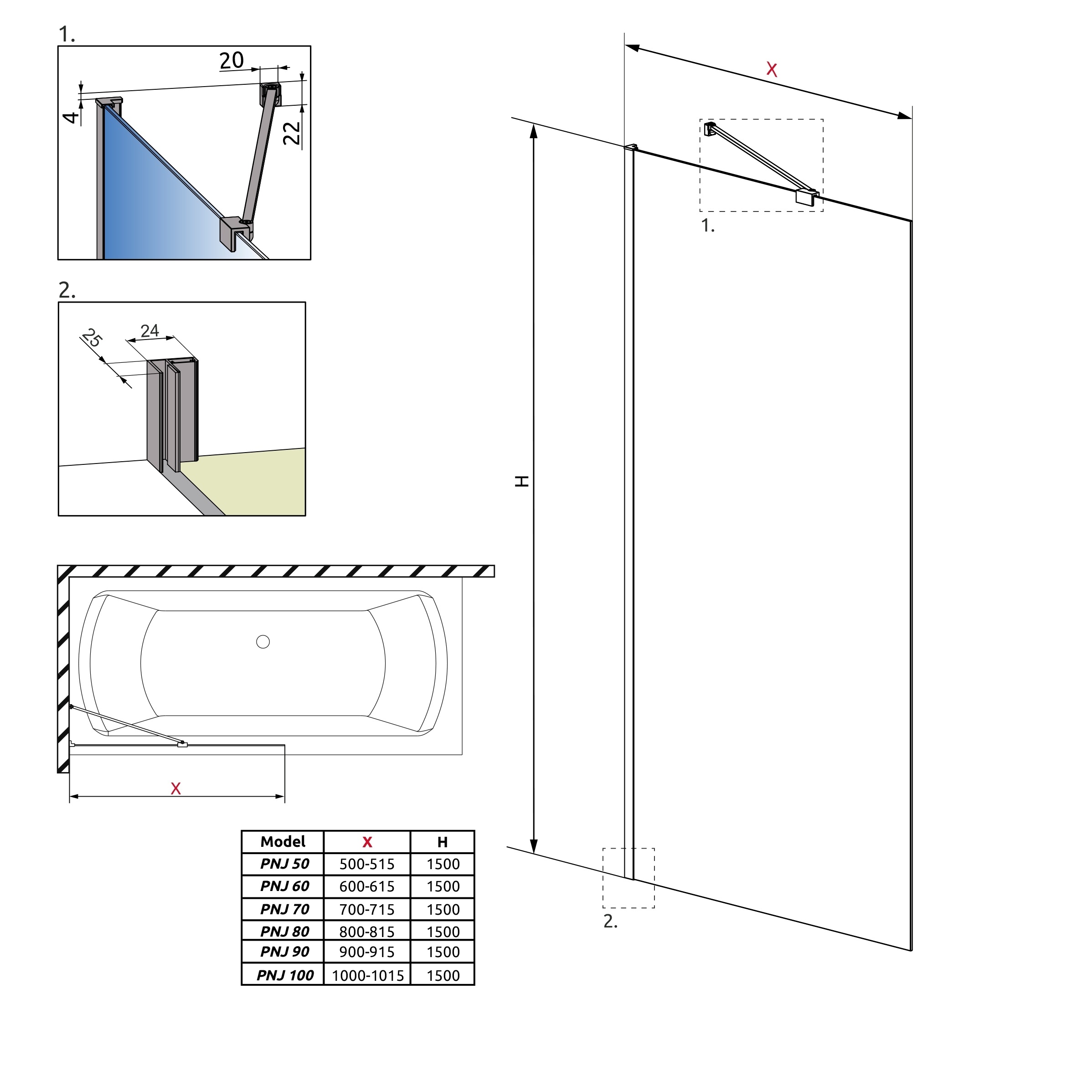Стекло крепится к стене с помощью пристенных профилей (с регулировкой).