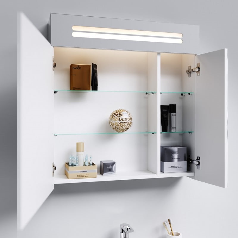 Особенностью зеркальных шкафов коллекции является внешняя фоновая подсветка, которая освещает и внутреннее пространство.