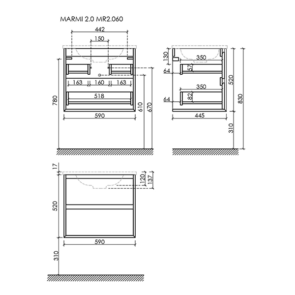 Тумба подвесная SANCOS Marmi 2.0 590х445х520 мм дуб чарльстон c двумя ящиками оснащенными доводчиками скрытого монтажа с системой Soft close (плавного закрывания), c фрезерованными ручками по всей длине фасада MR2.060ECH