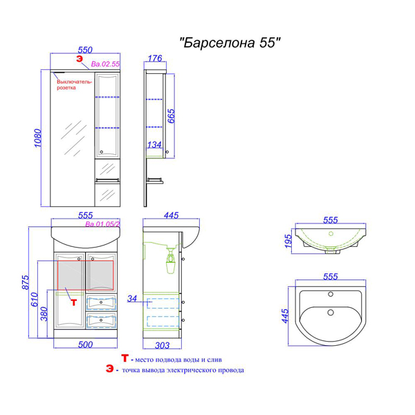 Тумба с раковиной AQWELLA Barcelona 55 555х445х830 мм Ba.01.05/2: