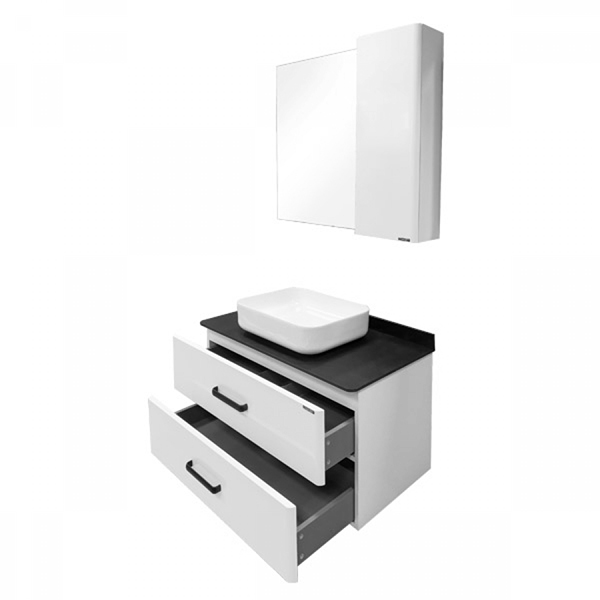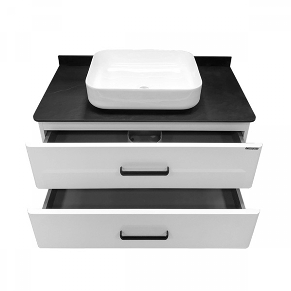 Тумба-умывальник в современном стиле с двумя выкатными ящиками и пространством для открытого хранения. Ящики оснащены системой с плавным закрыванием. Тумба укомплектована черными матовыми алюминиевыми ручками и столешницей, плинтусом из керамогранита и накладной прямоугольной раковиной из санфарфора.