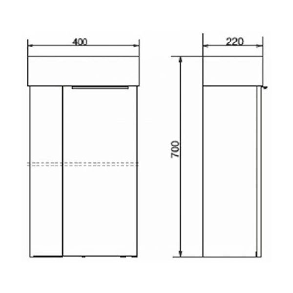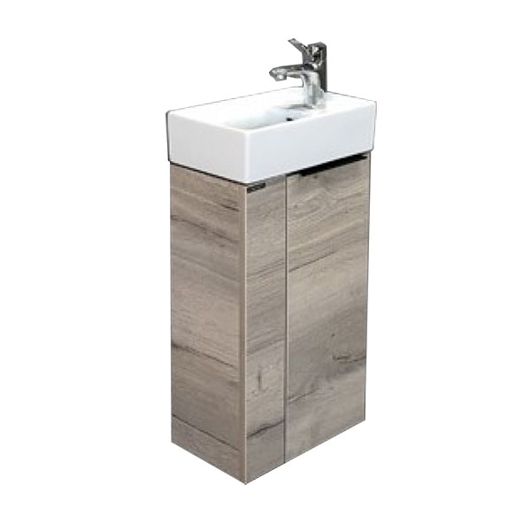 Компактная подвесная тумба с распашной дверцей. Петли оснащены системой плавного закрывания. За дверцей одна горизонтальная полка. Корпус и фасад с тактильным эффектом натуральной древесины. В комплекте асимметричная раковина с отверстием под смеситель справа. Тумба подготовлена для подключения водоснабжения снизу.