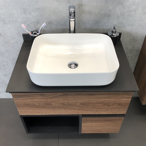 Тумба с раковиной COMFORTY Штутгарт 755х520х685 мм дуб тёмно-коричневый с черной столешницей
