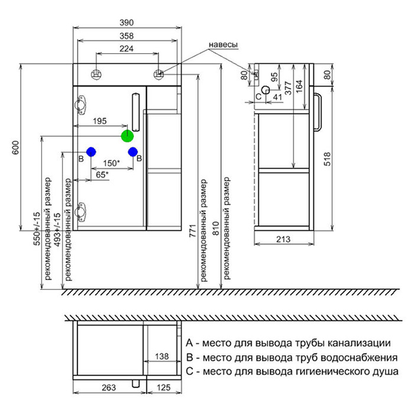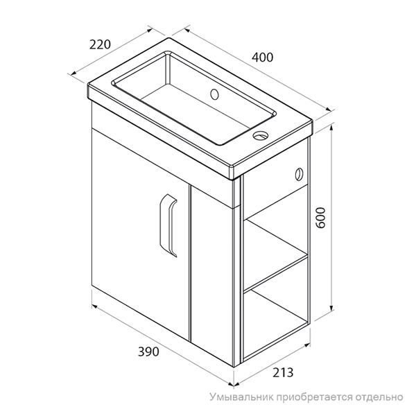 Размеры тумбы без умывальника: 213х390х600 мм (ДхШхВ)