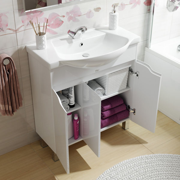 Тумба с раковиной Crystal 75 – выигрышное современное решение для ванной комнаты. Это модная и актуальная вариация классического дизайна. Белоснежные фасады без ручек идеально сочетаются с четкими очертаниями зеркала. Съемные полки за распашными фасадами образуют полезное пространство для хранения, которое можно обустроить по-своему, разместив все необходимое.