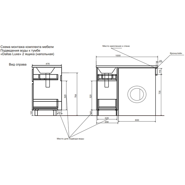 Комплект мебели Dallas Luxe левый 1000х482 напольный 3 ящика (ШхГхВ) 358х476х860 ФР-00002317