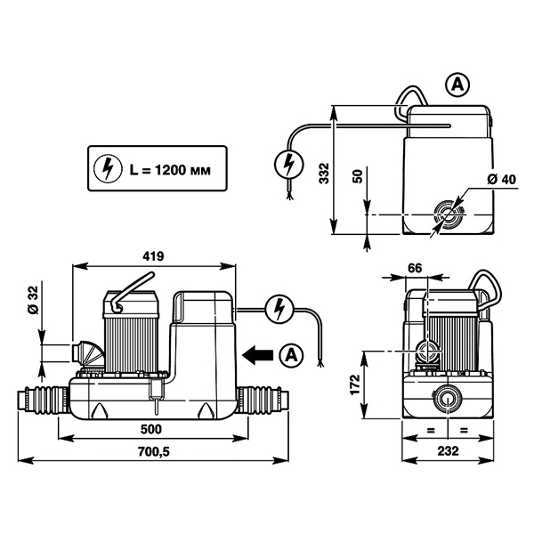 Диаметр отводного трубопровода 32 мм.