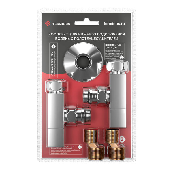 Комплект для подключения полотенцесушителя квадратные - вентиль г/ш 3/4х1/2 (2шт), эксцентрик 3/4х1/2 (2шт), отражатель 3/4 (2шт) хром глянцевый