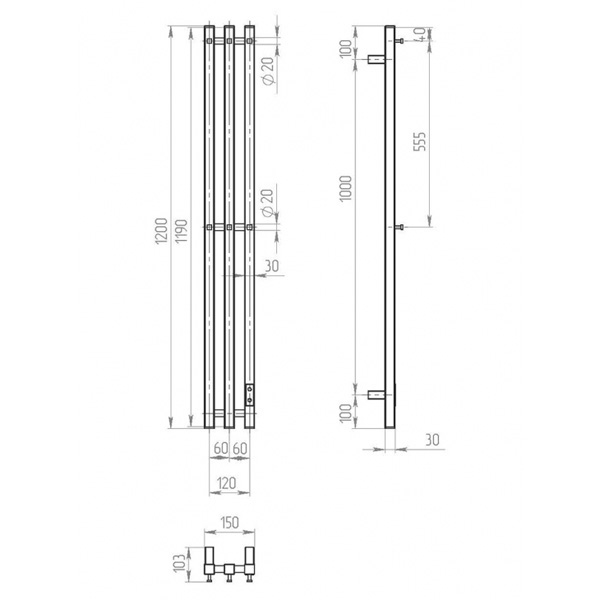 Полотенцесушитель электрический DVEEN X-3 Neo 1200х150 мм оружейная сталь К диммер