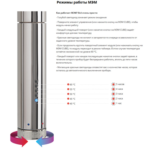 - Каждый следующий поворот (или нажатие кнопки на МЭМ CUBE) задаёт комфортную для вас температуру