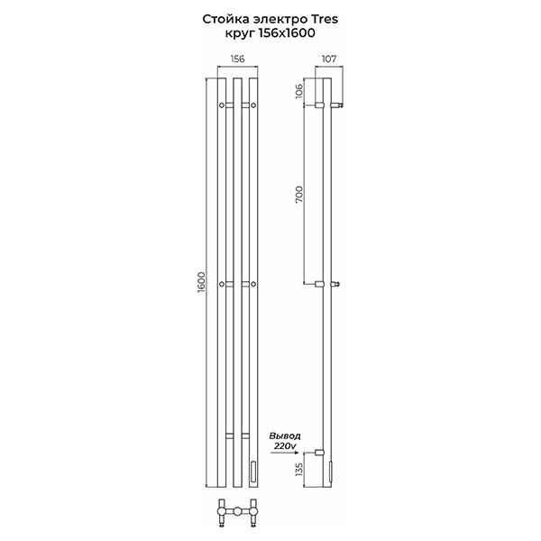 Полотенцесушитель электрический TERMINUS Tres 156x1600 мм круглый профиль полированный материал нержавеющая сталь