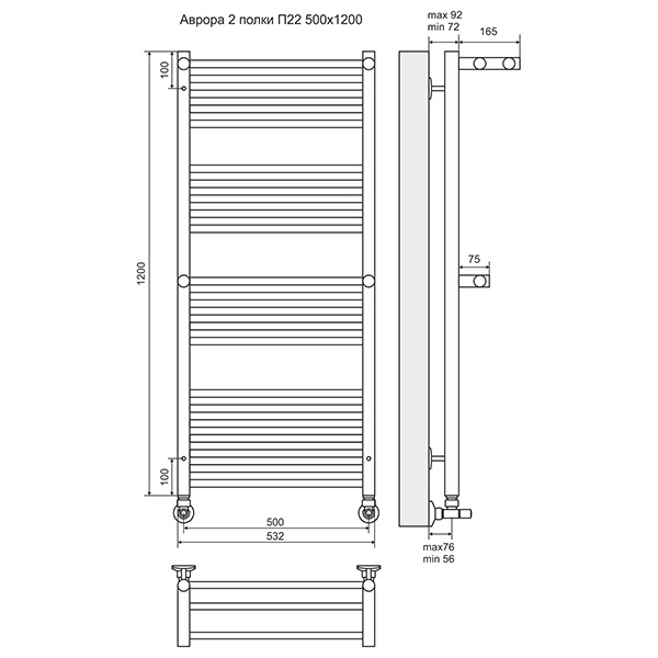 Полотенцесушитель водяной TERMINUS Аврора с двумя полками 532x1200 мм: