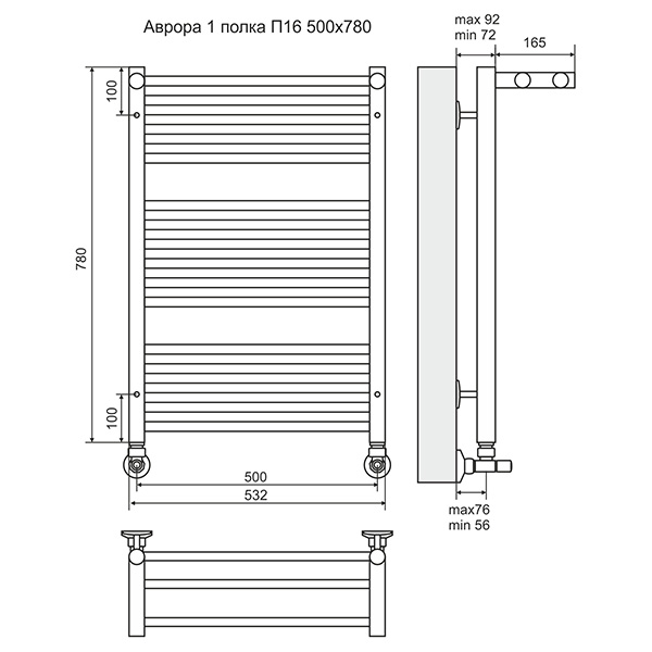 Полотенцесушитель водяной TERMINUS Аврора с одной полкой 532x780 мм: