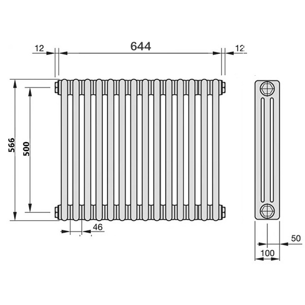 Радиатор трубчатый стальной ZEHNDER Charleston 3057 14 секций 3/4 566x100x644 мм, межосевое расстояние 500 мм, белый