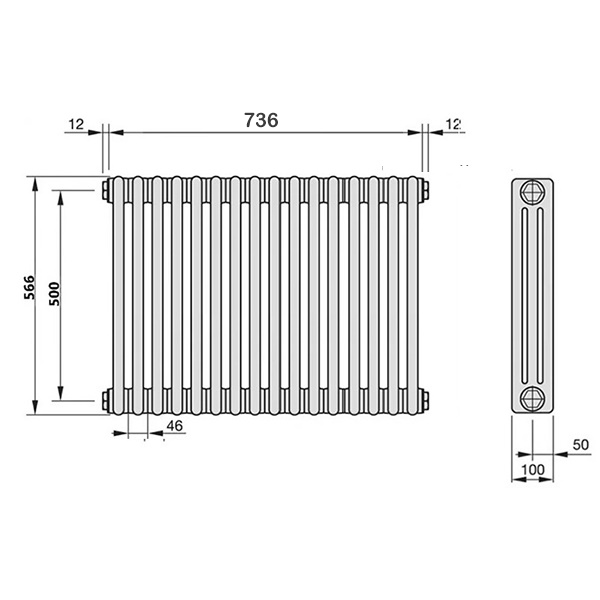 Радиатор трубчатый стальной ZEHNDER Charleston 3057 16 секций 3/4 566x100x736 мм, межосевое расстояние 500 мм, белый