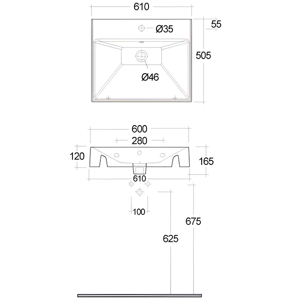 Раковина подвесная керамическая KLUDI Resa прямоугольная 610x500 мм с отверстием для смесителя черный матовый 59WW6139