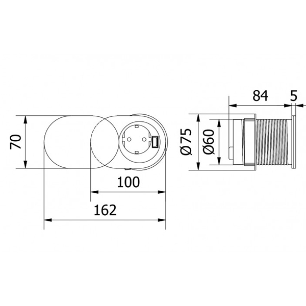 Встраиваемая розетка GTV SLIDE инокс 1x220V, розетка с заземлением типа Schucko 1xUSB 2,4A 60 мм, провод 1,9 м. овальная AE-BPW1S1UCH-51