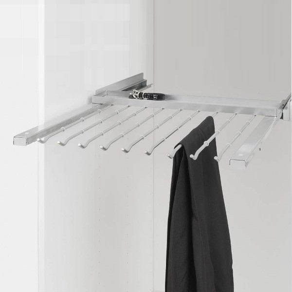 Вешалка для компактного и аккуратного хранения брюк. Способ крепления: на боковины шкафа. Полное выдвижение. Прекрасный обзор и удобный доступ. Конструкция, препятствующая соскальзыванию. Съемный лоток устанавливается сзади. В него удобно выкладывать мелочи, или, убрав его, хранить ремни. Легкий монтаж.