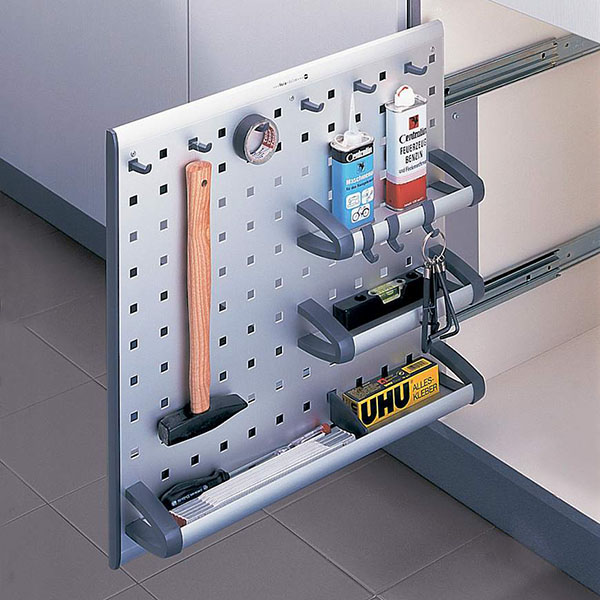 Выдвижная система (бутылочница) для узких ниш и шкафов с распашной дверью - отличное дополнение ко встроенному мусорному ведру или выдвижной системе сортировки. Направляющие полного выдвижения обеспечивают комфортный доступ и хороший обзор. Vario помогает содержать в порядке средства по уходу, щетки, подручные инструменты, противни и подносы, корм для домашних животных, мелкую утварь. Лотки, полочки, релинги и крючки можно переставлять на панели. Простой быстрый монтаж. Подходит для дооснастки уже эксплуатируемых распашных шкафов.