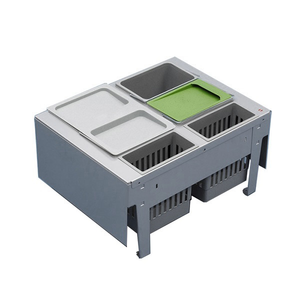 Рама из серебристого металла, ведро 18л с крышкой, 2 ведра по 8,5л, 2 контейнера по 4,1л из серого пластика, верхняя стационарная крышка из металла, крепежи.