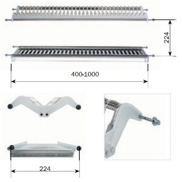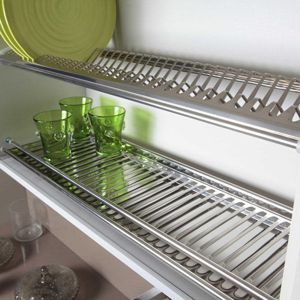Модель с выдвижным поддоном и раздвижной конструкцией полки для тарелок позволяет адаптировать ее для шкафов различной глубины.
