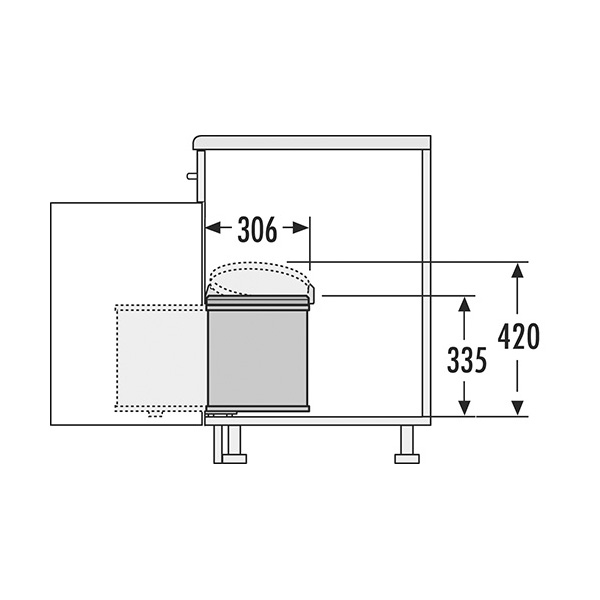 Ведро открывается синхронно с фасадом - не нужно к нему прикасаться, чтобы положить мусор. Внутреннее ведро, изготовленное из гигиеничного пластика, легко вынимается для чистки, его также можно использовать по хозяйству. Минимальная ширина шкафа для встройки - 400 мм. Не создает нагрузки на фасад, не перекашивает его в процессе эксплуатации.