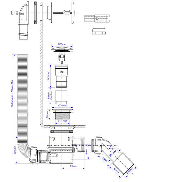 Трап бутылочный (1 1/2 х 40 мм) для ванн с переливом (L700 мм х D34 мм)