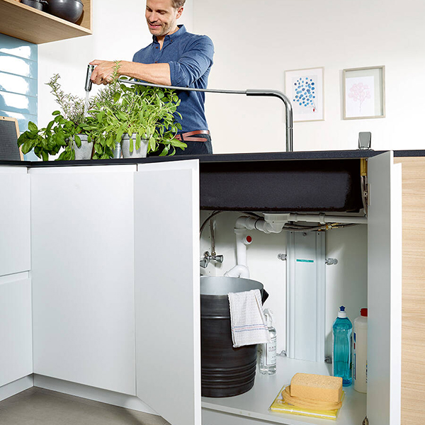 Таким образом, sBox предлагает ежедневный комфорт при использовании выдвижного душа или вытяжного шланга. А надежная защита внутри блока надолго обеспечивает функциональность водопроводящего шланга. Место для sBox найдется даже в самом маленьком нижнем шкафу. Плоскую коробочку высотой всего 52 см можно установить даже в условиях недостатка места, в углу или в низком кухонном шкафу.