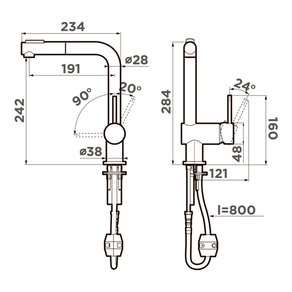 Практичный однорычажный смеситель выполнен в современном стиле и снабжен высоким поворотным изливом и вытяжным шлангом.