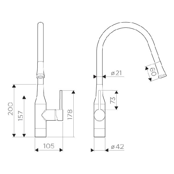 Смеситель выполнен в ультрасовременном стиле и снабжен высоким поворотным шлангом, который при изменении формы всегда остается в устойчивом положении