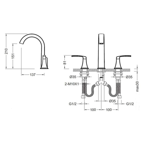 Смеситель для раковины на три отверстия ZEEGRES Como со скрытой частью в комплекте 17008001