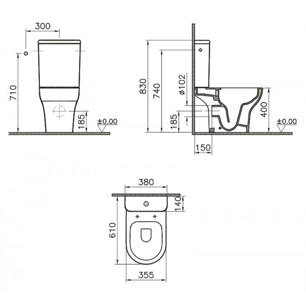 Унитаз компакт безободковый VITRA Zentrum Open-back Rim-ex сиденье с механизмом плавного закрывания SoftClose 610х355х830 мм 9824B003-7207