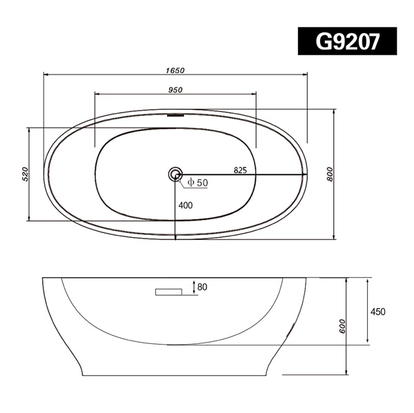 Ванна акриловая свободностоящая ABBER 1650x800x600 мм в комплекте со сливом перелива AB9207