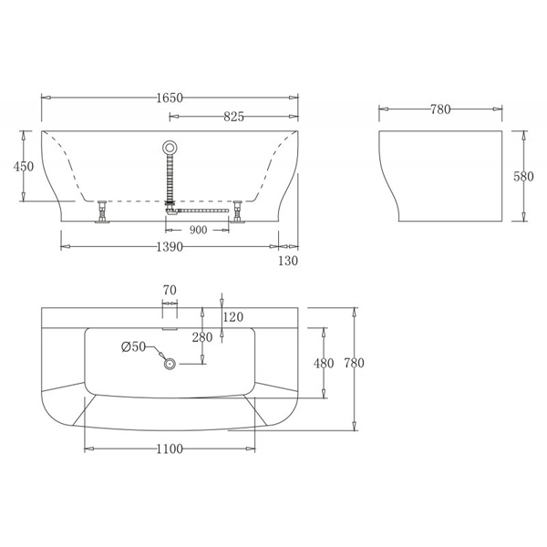 Ванна акриловая пристенная BELBAGNO 1650x780x590 мм белая в комплекте со сливом (донным клапаном) цвета хром, без перелива BB74-1650-W0