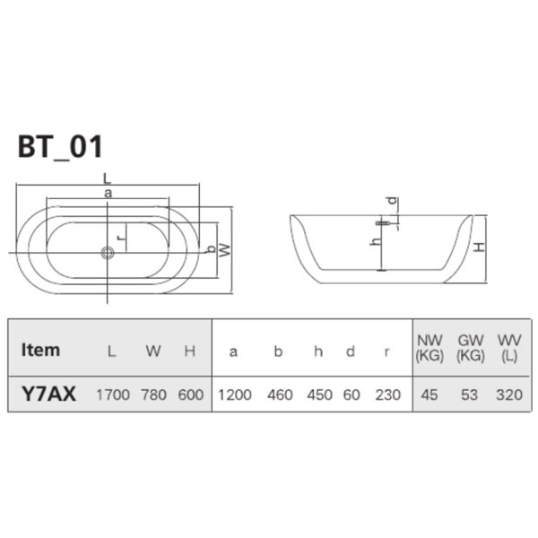 Ванна акриловая отдельностоящая HATRIA 170x78x60 см Y7AX25: