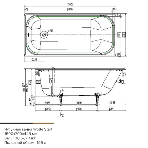 Ванна чугунная WOTTE Start УР 1500х700х445 мм БП-э0001102: