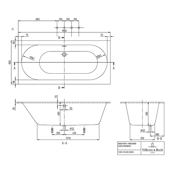 Ванна квариловая VILLEROY&BOCH Oberon Duo 1900х900 мм UBQ199OBE2V-01