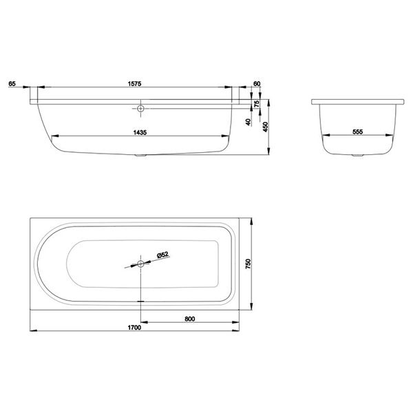 Ванна стальная прямоугольная BETTE Ocean 1700x750 мм перелив по центру спереди область ног справа 8855-000