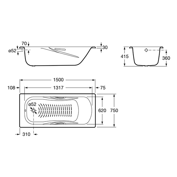Ванна стальная ROCA Princess 1500х750x415 мм с отверстиями для ручек 2204.E.000.0