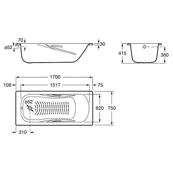 Ванна стальная ROCA Princess 1700х750x415 мм с отверстиями для ручек 2202.E.000.0