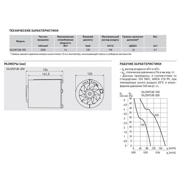 Вентилятор канальный вытяжной с низеим уровнем шума SOLER&PALAU Silentub-200, Макс. расход воздуха (м3/ч), Диаметр воздуховода (мм) 120,