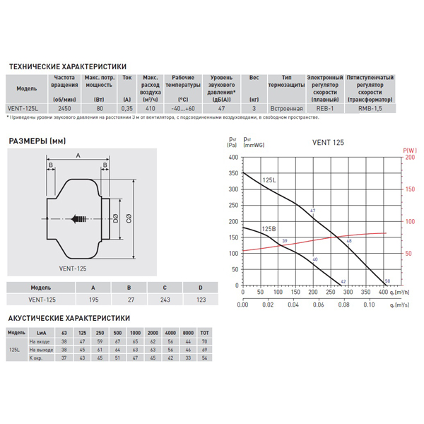 Вентилятор канальный центробежный SOLER&PALAU Vent-125L. расход воздуха (м3/ч) 410. диаметр воздуховода (мм) 125, мощность (Вт) 80