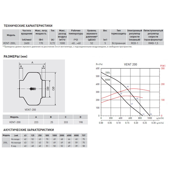 Вентилятор канальный центробежный SOLER&PALAU Vent-200L, мощность (Вт) 147, расход воздуха (м3/ч) 970, диаметр воздуховода 200 мм