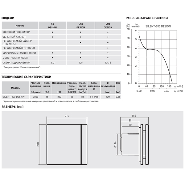 Вентиляторы SILENT DESIGN изготавливаются из высококачественного и экологичного АБС – пластика, комплектуются обратным клапаном и электродвигателем постоянного тока (230-50 Гц), класс изоляции В, со встроенной термозащитой.